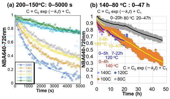 Changes with time in the normalized 640–720 nm band areas, due mainly to Chl a, after the dehydration during heating to 200–150 °C of Japanese maple leaves every 1 min for 6 h by the in situ Vis NIR monitoring (Figure 2) are shown in Figure 8a (only for 5000 s are shown) (Table 1). The normalized 640–720 nm band areas show larger decreases at higher temperatures. Some fluctuations can be observed for several data sets. These are mainly due to fluctuations in light environments that could not be controlled during the heating experiments. The thin leaf samples might also move and deform during the dehydration process. Despite some fluctuations, decreases with time in the normalized 640–720 nm band areas appear quasi-exponential. These Chl a decreases within 2 h at 200–150 °C correspond to the initial Chl a decreases by dissociation of Chl a from photosynthetic protein complexes without much photochemical damage, based on the fluorescence results in Section 3.3.