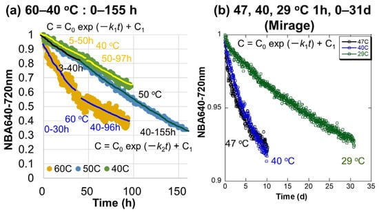 Decreases with time in the normalized 640–720 nm band areas due mainly to chlorophyll a during heating of Japanese maple leaves (Table 1): (a) at 60, 50, and 40 °C for 155 h; (b) at 47, 40, and 29 °C for 31 days. Fitting curves by C = Co exp (–kt) + C1 are schematically shown for the initial (rate constants k1) and the later (rate constants k2) periods for 60, 50, and 40 °C, while for 47, 40, and 29 °C, measured by the spectrometer (Mirage) in the incubator, only one exponential decay fitting was conducted (the fitting curves are immersed in many data points).