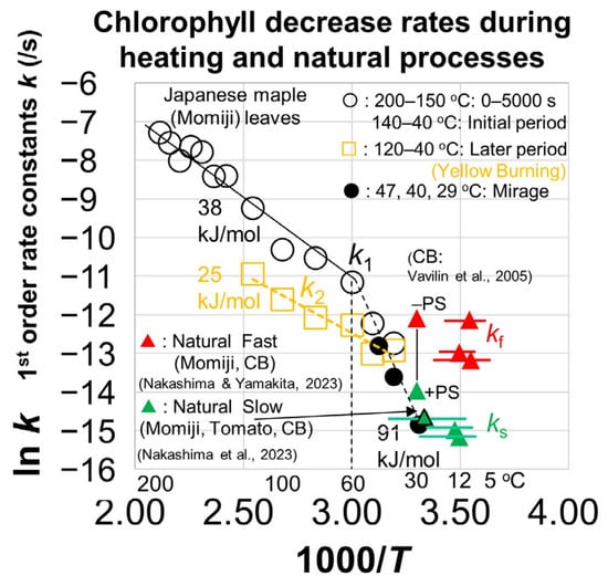 - The faster Chl a decrease rate constants kf for the natural senescence of the Japanese maple leaves in our previous study [9] are close to the extension of the linear trend of the initial Chl a decrease rates k1 at 200–60 °C with Ea = 38 kJ·mol−1.