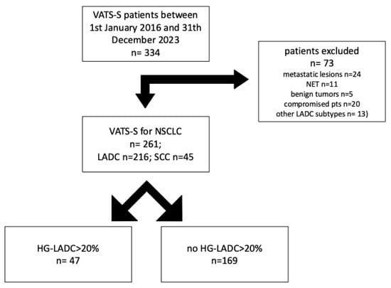 From January 2016, n = 261 cIA NSCLC patients were treated with intentional VATS-S at our center and analyzed; at pathology, n = 45 (17.2%) patients had squamous-cell carcinoma, whereas n = 216 (83.8%) were operated for LADC. In the LADC group, n = 169 (78.2%) had a low or intermediate LADC pattern, whereas n = 47 (21.7%) had HG-LADC > 20%.