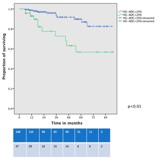 At a median follow-up of 36 months, 33 VATS-S patients died of any cause and n = 22 of a cancer-related cause; of these, n = 7 were in the HG-LADC > 20% group.