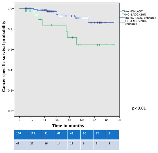 Cancer-specific survival curve of VATS-S patients comparing low- and intermediate-grade LADC with HG-LADC > 20%.