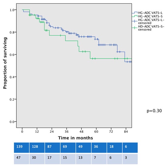 In a further survival analysis, comparing the OS of contemporary patients with clinical-stage IA HG-LADC >20% who underwent VATS-S and VATS–lobectomy, no significant differences were identified (5-year OS 56% vs. 64%, p = 0.30, Figure 4).