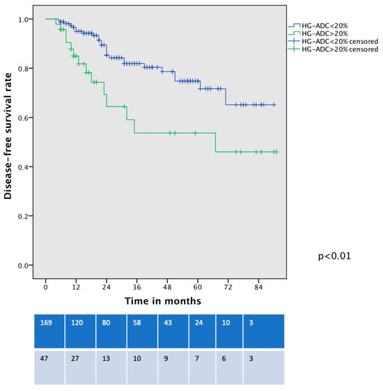Disease-free survival curve of VATS-S patients comparing low- and intermediate-grade LADC with HG-LADC > 20%.