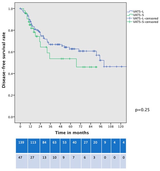 Disease-free survival curve of cIA HG-LADC > 20% patients undergoing VATS-S or VATS-L.