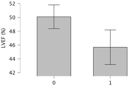 Means of LVEF between patients without and patients with a psychiatric diagnosis. Note. Patients without a psychiatric diagnosis “0”; patients with a psychiatric diagnosis “1”.
