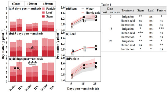 Dry matter of oat stem, leaf, and panicle under two foliar applications (HA and water) with three irrigation amounts (60 mm, 120 mm, and 180 mm) at 5, 15, and 25 DPA (a–c). Dry matter of oat stem, leaf, and panicle under two foliar applications (HA and water) at 5, 15, and 25 DPA (d–f). Combined analysis of variance for parameters of irrigation amount and foliar application, dry matter of oat stem, leaf, and panicle at 5, 15, and 25 DPA (Table 1). Values are means ± standards deviation (n = 3, (a–c)) (n = 9, (d–f)). Different lowercase letters with the column under the same DPF mean significant differences at p < 0.05 by Fisher’s Least Significant Difference (LSD) test. * p < 0.05, ** p < 0.01, *** p < 0.001, and ns no significant difference.