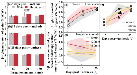 β-glucan content of oat grains under two foliar applications (HA and water) with three irrigation amounts (60 mm, 120 mm, and 180 mm) at 5, 15, and 25 DPA (a–c). β-glucan content of oat grains under two foliar applications (HA and water) at 5, 15, and 25 DPA (d). β-glucan content of oat grains under three irrigation amounts (60 mm, 120 mm, and 180 mm) at 5, 15, and 25 DPA (e). Δβ-glucan content from foliar application of humic acid and water under three irrigation amounts (60 mm, 120 mm, and 180 mm) of oat grains at 5, 15, and 25 DPA (f). Values are means ± standards deviation (n = 3, (a–c,f)) (n = 9, (d,e)). *** p < 0.001. Different lowercase letters with the column under the same DPF mean significant differences at p < 0.05 by Fisher’s Least Significant Difference (LSD) test.