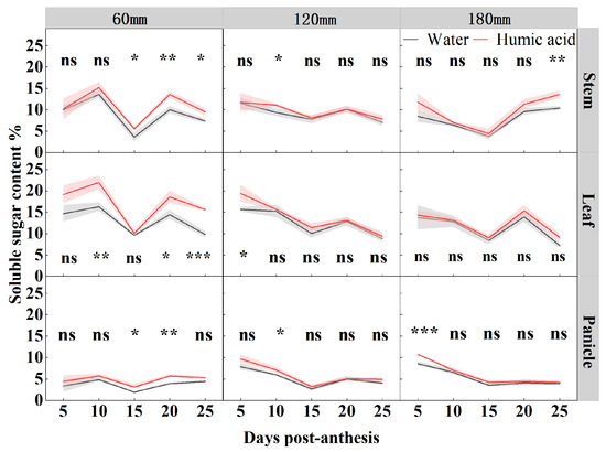 Soluble sugar contents of oat stem, leaf, and panicle under two foliar applications (HA and water) with three irrigation amounts (60 mm, 120 mm, and 180 mm) at 5, 10, 15, 20, and 25 DPA. Values are means ± standard deviation (n = 3). * p < 0.05, ** p < 0.01, *** p < 0.001, and ns no significant difference.
