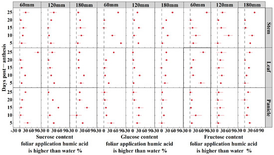 The sucrose, glucose, and fructose content from foliar application of HA was found to be higher than that of water under three irrigation amounts (60 mm, 120 mm, and 180 mm) for oat stem, leaf, and panicle at 5, 10, 15, 20, and 25 DPA (Figure 4).