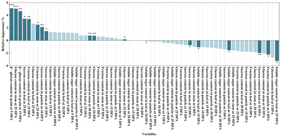Relative importance of variables of RF models on the β-glucan content in grain at 25 DPA. * p < 0.05, ** p < 0.01, *** p < 0.001.