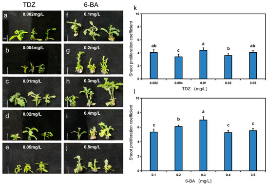 Phenotypes of Q. robur shoot proliferation under different hormone treatments. (a–j) Phenotypes of Q. robur shoot proliferation under TDZ (0.002, 0.004, 0.01, 0.02, and 0.05 mg/L) and 6-BA (0.1, 0.2, 0.3, 0.4, and 0.5 mg/L) treatments at 30 d, bar = 1 cm. (k) Effect of different concentrations of TDZ on the shoot proliferation coefficient of Q. robur. (l) Effect of different concentrations of 6-BA on the shoot proliferation coefficient of Q. robur. Letters on each bar indicate significant differences, p < 0.05. Analyses were performed using a one-way ANOVA test and data are means ± standard error (n = 30).