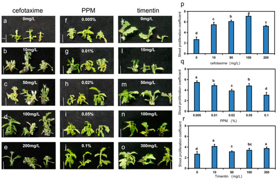 Furthermore, the time to reach 80% shoot proliferation at various timentin concentrations was 6–7 days, with shoot proliferation coefficients significantly differing, from 2.67 to 4.13 (Supplemental Table S5, Figure 2k–o,r). The quickest proliferation time was observed at 100 mg/L, while the highest coefficient of 4.13 was at 10 mg/L (Supplemental Table S5). The results indicated that the highest shoot proliferation coefficient occurred at a timentin concentration of 10 mg/L, with no significant difference between the 300 mg/L and 100 mg/L groups, but both were significantly greater than the other groups (Supplemental Table S5).