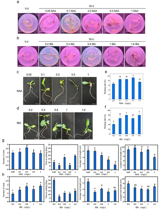 Phenotypes of adventitious root formation of Q. robur in media containing different concentrations of NAA and IBA. (a,b) Phenotypes of Q. robur rooting under different concentrations of NAA and IBA treatment at 30 d, bar = 1 cm. (c,d) Individual seedling phenotypes of adventitious root formation in Q. robur under different concentrations of NAA and IBA treatment at 30 d, bar = 1 cm. (e,f) Effect of different concentrations of NAA and IBA on rooting rate of Q. robur. Letters on each bar indicate significant differences, p < 0.05. Data are means ± standard error (n = 30). (g,h) Analysis of rooting time, average number of roots, average root length, and longest root length of inoculated seedlings under different concentrations of NAA and IBA. Letters on each bar indicate significant differences, p < 0.05. Data are means ± standard error (n = 30).