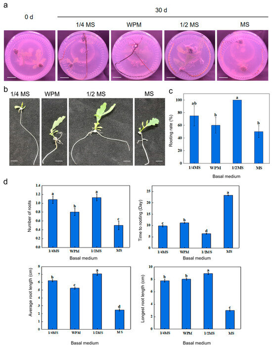 To explore the effect of different basal media on rooting rate and root growth in Q. robur, experiments were conducted on selected shoots of Q. robur with growth conditions consistent with other groups. The highest rooting rate of 100% was achieved in the 1/2MS medium, which is significantly higher than the WPM and MS media, with no significant difference from 1/4MS (Supplemental Table S7, Figure 4c). The 1/4MS group achieved 75% rooting, WPM 60%, and MS 50% (Supplemental Table S7, Figure 4c).