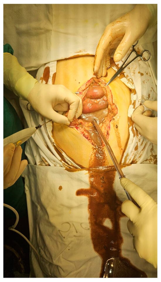 Peritonitis due to the perforation of the right colon cancer (Source: Emergency Clinical Hospital “Sf Apostol Andrei” Galaţi, Surgical Clinic. The patient gave her consent to use her personal data and photos by signing the hospitalization form).