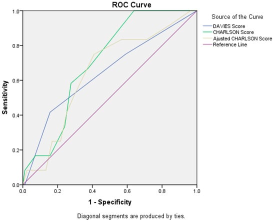 ROC curve for Davies score, Charlson score, and adjusted Charlson score.