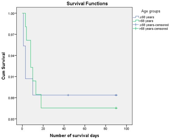 We analyzed the risk of postoperative death, knowing that 12.6% of patients died postoperatively and 87.4% managed to survive the first 3 months (90 days) after surgery. We performed the survival analysis using the Kaplan–Meier method and the Log Rank (Mantel–Cox) statistical method, considering the number of days of postoperative survival as a time variable. (Figure 3, Figure 4, Figure 5 and Figure 6) We also estimated the mean survival duration. The results obtained were confirmed using Cox Regression (HR). The results are presented in Table 4.