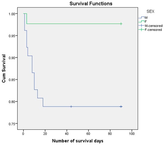 Of the female patients, 2.33% died postoperatively, compared to the male patients of whom 21.15% died. The mean estimated number of days of survival was 72,481 days for males and 87,977 days for females. The mortality risk associated with sex was HR = 0.102, 95% CI (0.013, 0.787) (p = 0.029).