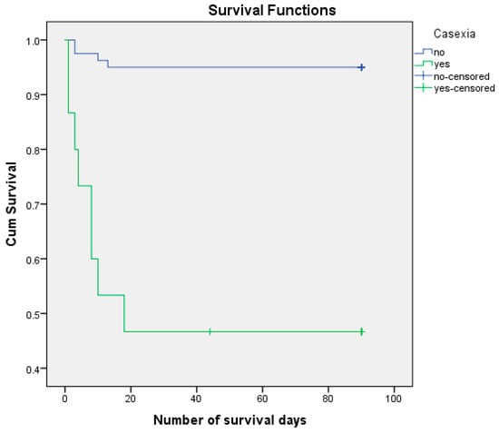 Cachexia may be associated with the risk of postoperative death—HR = 14.179, 95% CI (4.246, 47.346)) (p < 0.001). A total of 53.33% of patients with cachexia died postoperatively and only 5.0% of patients without cachexia died postoperatively. The estimated number of days of survival in patients with cachexia was 45,533, and in those without cachexia was 85,863.