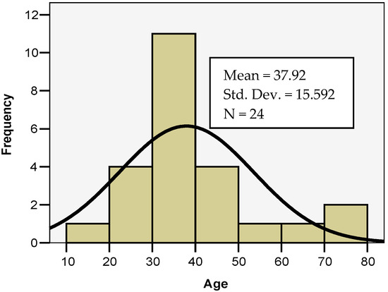 In both study groups, most patients were men, with a 3:1 male-to-female ratio, probably due to working conditions. Most patients were 18 to 45 years old (19 patients), particularly young adults, emphasizing the significance of the functional and esthetic aspect (Figure 1). The mean age of the study groups was 37.92 ± 15.592 years (Figure 2).
