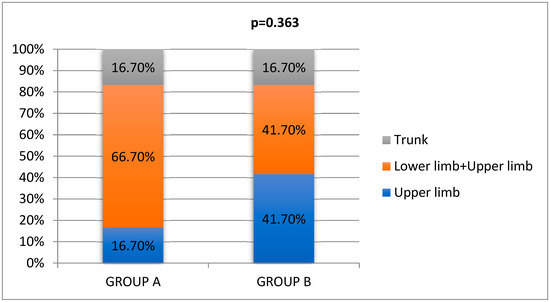 In group A, 66.7% of burn injuries were located on both lower and upper limbs (LL + UL), while in group B we identified equal distribution of 41.7% of injuries both on the upper limbs (UL) and on all four limbs (LL + UL) (Figure 3). It is worth noting that all the patients who suffered burns on their lower limbs also had burns on their upper limbs, possibly due to the defense reflex.