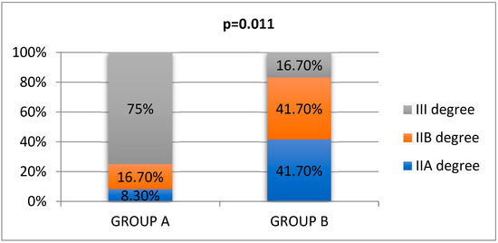 In 54.16% of the cases, patients suffered from second-degree burns, both superficial partial-thickness and deep partial-thickness burns, while 45.83% presented third-degree injuries. Six patients were diagnosed with superficial partial-thickness burns (IIA), seven patients had deep partial-thickness burns (IIB), and eleven patients experienced third-degree burns. The statistical analysis indicated mainly third-degree burns in group A, while in group B the predominant burns were second-degree (Figure 4).
