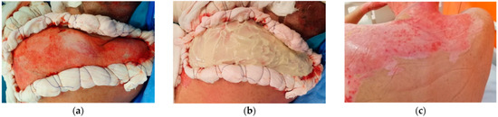 Enzymatic debridement was performed for all patients, targeting both superficial and deep partial-thickness, as well as full-thickness burn lesions (Figure 7a–c). This approach led to the removal of varying degrees of eschar until the appearance of pinpoint bleeding as an indication of healthy tissue. The efficacy of this treatment was further corroborated by changes in coloration observed during laser Doppler imaging conducted post-debridement. Notably, the deep burn area, initially exhibiting blue coloration, transitioned to green, which signifies improved vascularization compared to the previously blue-colored tissue (Figure 8a,b).