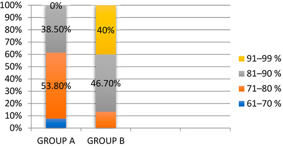 In group A, after the application of Nexobrid®, 53.8% of patients presented 71–80% eschar removal. Higher rates of 81–90% were achieved in 38.5% of cases, while lower rates of 61–70% were noted in 7.7% of cases (p = 0.005). Meanwhile, in group B, 40% of patients achieved 91–99% eschar removal, 46.7% were at 81–90%, and 13.3% presented eschar removal in proportions of 71–80%, as shown in Figure 9.