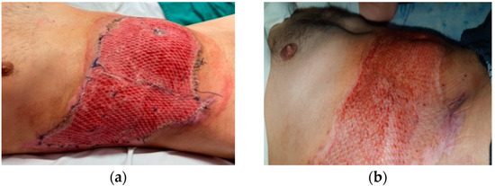Only three patients included in the study, one from group A (Figure 10a,b) and two from group B, required a split-thickness skin graft harvested from the antero-lateral thigh, using electrodermatome with a thickness of 0.2–0.3 mm. These patients achieved complete graft uptake on an area of 8%, 9%, and 10% respectively.