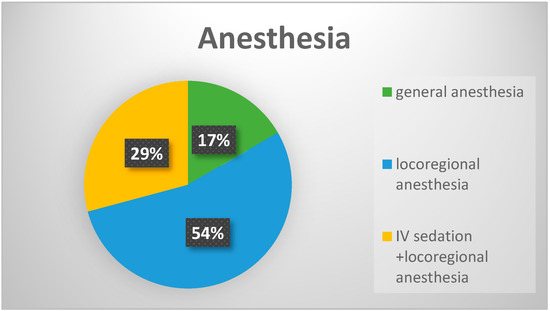 For patients with burn injuries on both the upper and lower limbs, we adopted a combined approach using loco-regional anesthesia and intravenous sedation (13 cases). The choice of loco-regional anesthesia was based on the extent and severity of the burns, as indicated in Figure 11. For the lesions situated on the trunk, we decided to perform general anesthesia (four cases). This approach helped us prevent and avoid known complications of general anesthesia.
