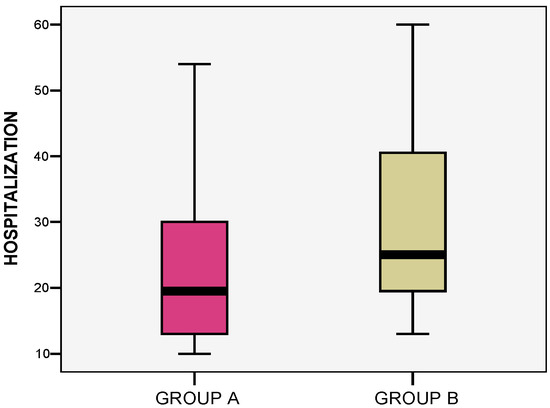 Hospitalization duration was analyzed to assess speed of healing. Patients in group A required between 10 and 54 days (mean 23.67 ± 13.81), while the patients in group B spent between 13 and 60 days in hospital (mean 30.33 ± 14.84), as shown in Figure 12. The Student t-test result was non-significant (p = 0.267). Strong positive associations were noted between TBSA and the number of hospitalization days in both groups (r = +0.982 at p = 0.001, and r = +0.973 at p = 0.001, respectively) (Figure 13). Patients with contaminated wounds needed longer healing periods compared to non-contaminated burns, with an average healing time of 36.4 days for group A, and 41.6 days for group B.