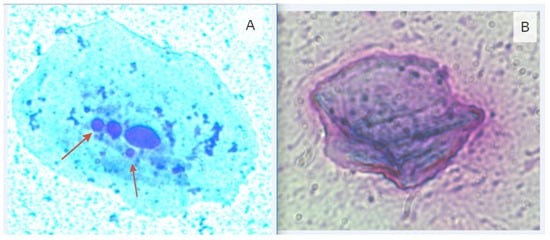 Epithelial cells with signs of disturbance (magnification of 1000×): (A)—a cell with micronuclei; (B)—an anuclear cell. Arrows display additional nuclear formations in cells (micronuclei).