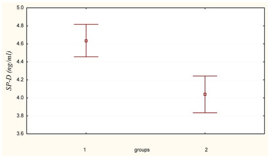 A comparative assessment of surfactant protein D (SP-D) levels was conducted, revealing an elevated concentration in the serum of Group 1 workers. The SP-D level in Group 1 was measured at 4.63 ± 0.18 (4.26–5.01) ng/mL, which is 15% higher compared to Group 2, where the corresponding value was 4.03 ± 0.20 (3.59–4.48) ng/mL (Figure 2—Comparative analysis of serum surfactant protein D levels in female subjects (M ± m; CI)).