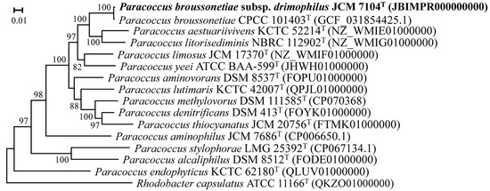 - Deng, Y.; Li, C.-J.; Zhang, J.; Liu, W.-H.; Yu, L.-Y.; Zhang, Y.-Q. Extensive genomic study characterizing three Paracoccaceae populations and revealing Pseudogemmobacter lacusdianii sp. nov. and Paracoccus broussonetiae sp. nov. Microbiol. Spectr. 2024, 12, e0108824. [Google Scholar] [CrossRef]
