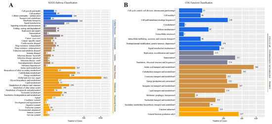 Analysis of the KEGG function classification (A), and analysis of the COG function classification (B) based on the genomes of stain NGMCC 1.201697T.