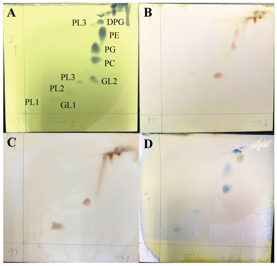 Polar lipids profile of strain NGMCC 1.201697T. The plates in Figure 5 (A–D) are sprayed with molybdophosphoric acid, ninhydrin, α-naphthol and molybdenum blue staining agent to show all polar lipids present, respectively. DPG, diphosphatidylglycerol; PE, phosphatidylethanolamine; PC, phosphatidylcholine; PG, phosphatidylglycerol; GL1–2, two unidentified glycolipids; PL1–4, unidentified phospholipid.