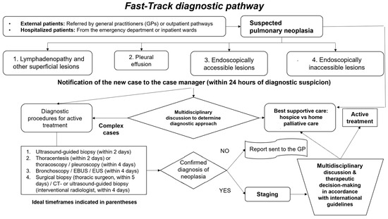 - Pujol, J.L.; Mercier, G.; Vasile, M.; Serre, I.; Vernhet-Kovacsik, H.; Bommart, S. Brief Report: A Multidisciplinary Initial Workup for Suspected Lung Cancer as Fast-Track Intervention to Histopathologic Diagnosis. JTO Clin. Res. Rep. 2023, 4, 100526. [Google Scholar] [CrossRef] [PubMed]