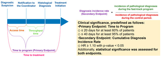 A comparative analysis was conducted between two consecutive patient cohorts: those managed under standard care pathways (January–April 2024) and those enrolled in the Fast-Track Program (May–August 2024). The program’s effectiveness was assessed using key performance indicators (KPIs), including time to definitive diagnosis, adherence to diagnostic pathways, and patient satisfaction. The Fast-Track Program was assessed using predefined efficiency indicators and clinical significance thresholds, as summarized in Figure 3 and Table 3. Statistical significance was evaluated using a pre-set threshold of α = 0.05. In addition, clinical significance was predefined based on specific criteria for the primary and secondary endpoints. The primary endpoint, “program time”, was considered clinically significant if ≤20 days was achieved in at least 60% of patients or ≤40 days in at least 95% of cases. The secondary endpoint, “Cumulative Diagnosis Incidence Rate”, was considered clinically significant if HR ≥ 1.10 with p < 0.05, indicating a meaningful increase in diagnostic volume. Predefined statistical analyses included chi-square tests for categorical variables; a Fisher’s exact test for categorical data with small, expected frequencies; and a Student’s t-test for continuous variables to compare diagnostic timelines between groups.
