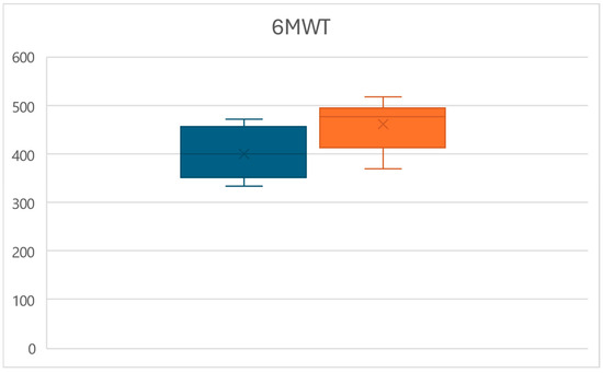 Similarly, at time T1, a significant increase in the distance walked at the 6MWT was observed (p < 0.01), with values increasing from an average of 398.7 ± 49.6 m to a mean of 460.9 ± 48 m, for an overall increase of 15.6% (Figure 2).