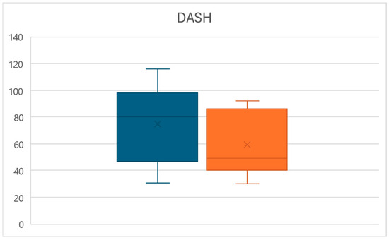 Likewise, at time T1, a significant decrease in the disability of the upper limb measured through the DASH score was observed (p < 0.01), with values reducing from an average of 74.6 ± 28.3 to a mean of 59.1 ± 23.8, for an overall reduction of 20.8% (Figure 5).