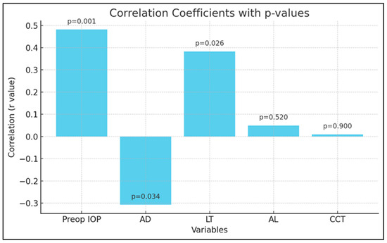 Correlation analyses (Table 3, Figure 1) indicated that a higher preoperative IOP was significantly associated with a greater percentage reduction in IOP (r = 0.482, p < 0.001). Additionally, both ACD and LT showed significant correlations with the percentage of IOP change. ACD was inversely correlated with IOP reduction (r = −0.307, p = 0.034), suggesting that shallower anterior chambers were associated with greater IOP decreases postoperatively. Conversely, LT was positively correlated with IOP reduction (r = 0.383, p = 0.026). AL and CCT did not show significant correlations with IOP change (p = 0.52 and p = 0.9, respectively).