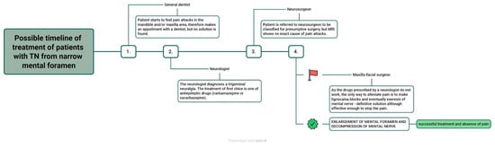 The flowchart of a possible timeline of treatment, containing a neurologist, a dentist, and surgeons.