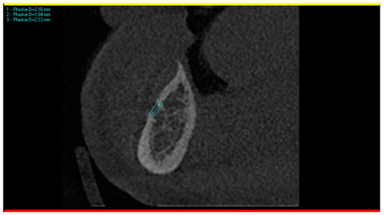 Fortunately, the patient felt relief just a few minutes after administration of the block anesthesia at the mental foramen. As the approximate cause was related to a mental nerve, the CBCT was analyzed again. Having in mind the hypothesis of professors Pawela and Wnukiewicz, the diameters of the metal foramina were analyzed in comparison with the inferior alveolar canal and with the opposite side. To obtain the most reliable result, each mental foramen was measured three times, and then, the mean vertical diameter was calculated. The measuring was conducted on a CBCT cross-section perpendicular to the panoramic curve, as presented in Figure 2.