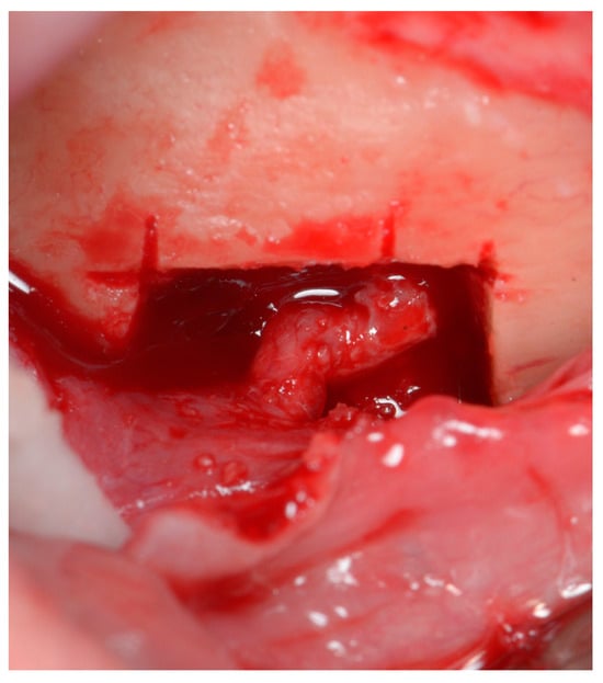 The patient received local anesthesia of 3 vials of 1.8 mL of articaine 4% with adrenaline 1:100,000. The full-thickness mucoperiosteal flap was elevated, with an incision on the top of the alveolar ridge and with one releasing incision mesially. The flap was carefully elevated around the mental foramen with blunt instruments to prevent puncturing the neurovascular bundle.
