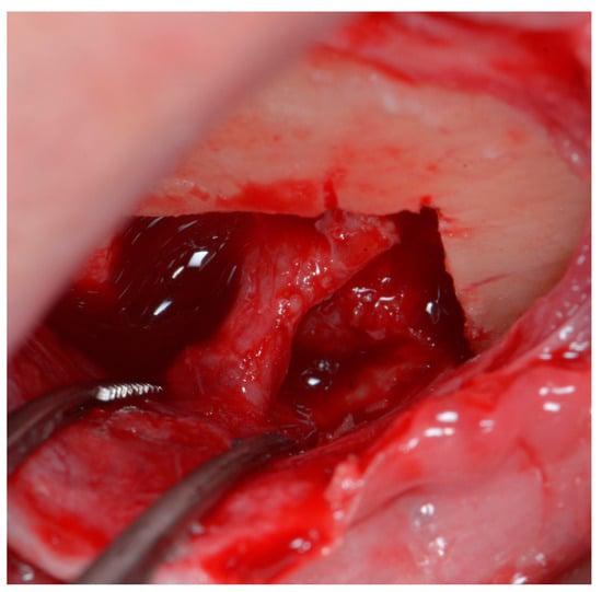 The second part of osteotomy creates diagonal lines from the corners of the rectangular area to the foramen, with special care not to damage the neurovascular bundle. Although piezosurgical tips are considered to cause very little damage to soft tissues, when used with excessive force, they may still result in irreversible injury [19]. The diagonal cuts enable the sectioning of the rectangular piece of the bone ring into four smaller separate pieces. If they are mobile, they can be easily removed. In case they are still fixed, due to the trabeculae of the cancellous bone, the pieces should be gently luxated with a rigid root elevator (or another rigid surgical tool). Using elastic tools deprives the operator of feeling how the bone behaves under applied force; hence it could potentially jeopardize the procedure, and it is therefore not recommended. When all bone pieces are mobile, they should be gently removed one by one, leaving the mental nerve loose (Figure 4).