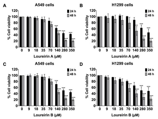The impacts of Loureirin A and Loureirin B on the viability of A549 and H1299 cells. The viabilities of A549 cells (A,C) and H1299 cells (B,D) were assessed following treatment with Loureirin A and Loureirin B at varying concentrations from 0 to 350 µM for 24 h and 48 h using the SRB assay. Cells treated with 0 µM of Loureirin A or Loureirin B are presented as 100% of the control. Data are presented as mean ± SD value obtained from three independent experiments. ** p < 0.01, and *** p < 0.001 compared with control group (0 µM).