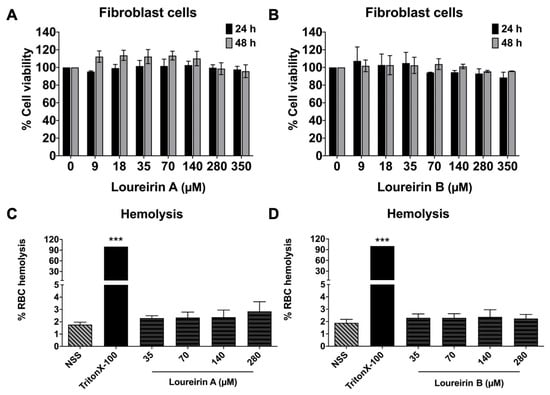 The impacts of Loureirin A and Loureirin B on the viability of primary human dermal fibroblast cells and red blood cells (RBCs). Fibroblast viability was assessed using the SRB assay after treatment with Loureirin A (A) and Loureirin B (B) at 0–350 µM for 24 and 48 h. RBC hemolysis was measured for Loureirin A (C) and Loureirin B (D), with NSS as the negative control and 0.5% Triton X-100 as the positive control (set as 100%). Data are presented as mean ± SD value obtained from three independent experiments. *** p < 0.001 compared to a negative control (NSS).