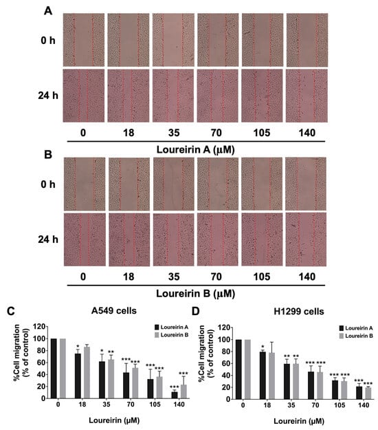 Loureirin A and Loureirin B suppressed A549 and H1299 cell migration in a wound-healing assay. Cells were treated with 0–140 µM Loureirin A or B for 24 h. Phase-contrast micrographs (×10) show scratch-wound distances in A549 cells treated with Loureirin A (A) and Loureirin B (B), while H1299 cell data are in Supplementary Figure S1. Quantitative analysis of A549 (C) and H1299 (D) cells is presented, with control (0 µM) set to 100% for migration calculations. Results are mean ± S.D. * p < 0.05, ** p < 0.01, *** p < 0.001 vs. control (0 µM).
