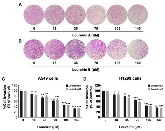 Loureirin A and Loureirin B suppressed A549 and H1299 cell invasion in Matrigel-coated trans-well assays. Cells were treated with 0–140 µM Loureirin A or B for 24 h. Phase-contrast images (×40) show the invaded A549 cells treated with Loureirin A (A) and Loureirin B (B), while H1299 cell data are in Supplementary Figure S2. Quantitative analysis of A549 (C) and H1299 (D) cells is presented, with control (0 µM) set to 100% for migration calculations. Results are mean ± S.D. * p < 0.05, ** p < 0.01, *** p < 0.001 vs. control (0 µM).